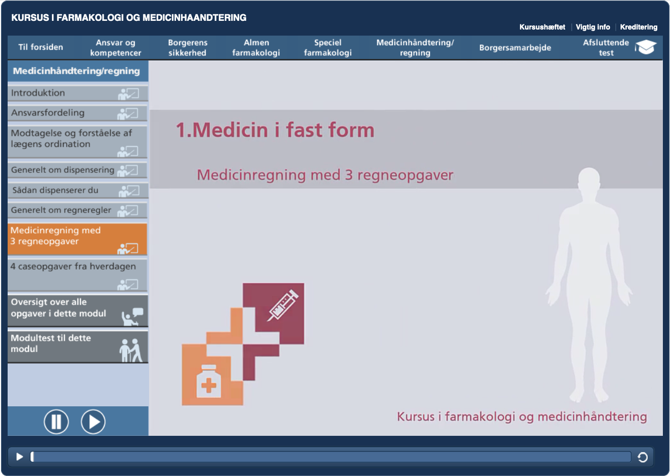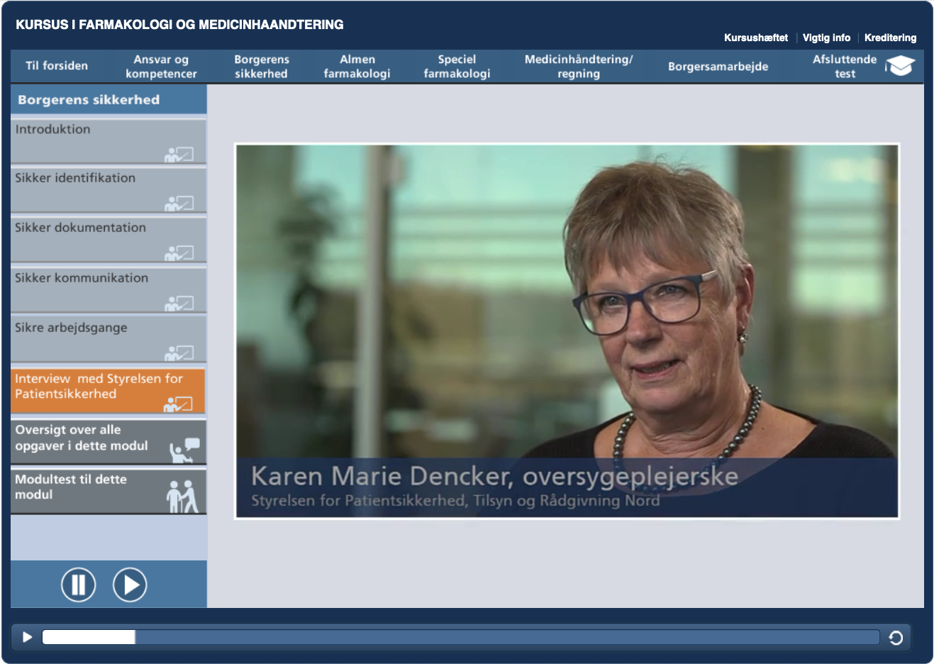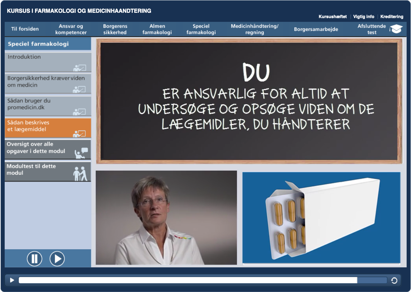 Modulerne veksler mellem videobaseret undervisning, små opgaver undervejs, interaktive cases og en modultest, som - efter den er bestået - giver adgang til næste modul.